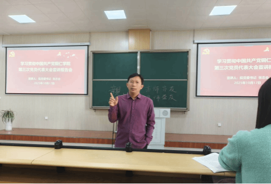 10月17日下午,国际学院党委书记张志会在博思楼203教室为24级英语专业学生宣讲中国共产党beat365中国唯一官网第三次党员代表大会精神。