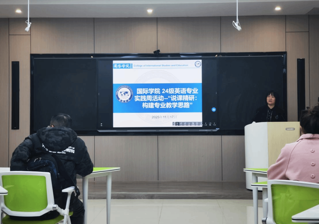 24级英语(师范)专业在明理楼A301开展以“说课精研:构建专业教学思路”为主题的实践活动。教学法教师高琼芳围绕说课“六大模块”,结合优秀说课视频展播与案例解析,系统讲解说课的核心概念与技巧。学生在确定选题后,在指导教师带领下积极投入说课稿的撰写与准备。