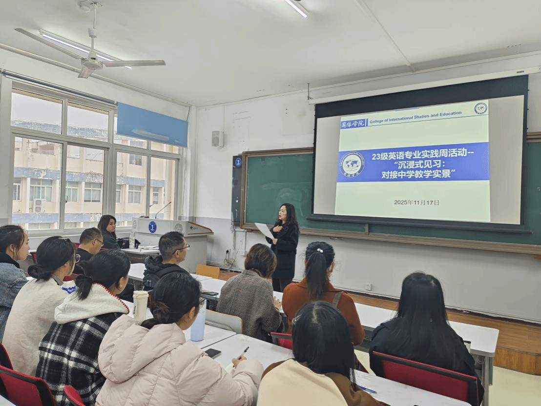 英语专业实践周启动仪式上,专业负责人汪萍老师指出,实践是衔接理论与职场的重要桥梁,实践周是各专业根据专业特色和培养要求在校内进行的实践活动,对不同年级的学生有不同的具体要求:23级学生应重点锤炼中学教学见习能力,24级师范生需深耕说课技能,她鼓励全体同学在实践中锻炼成长,提升综合素养。
