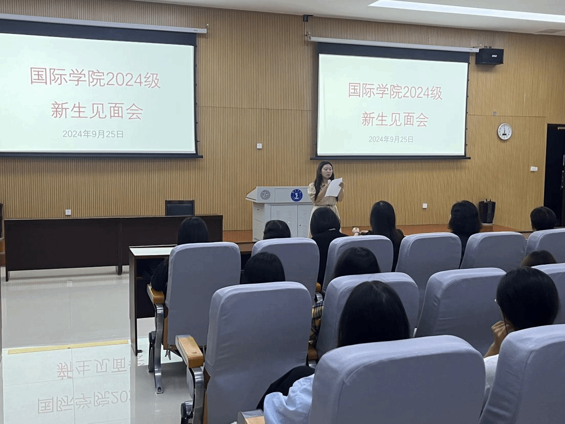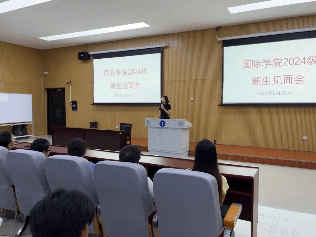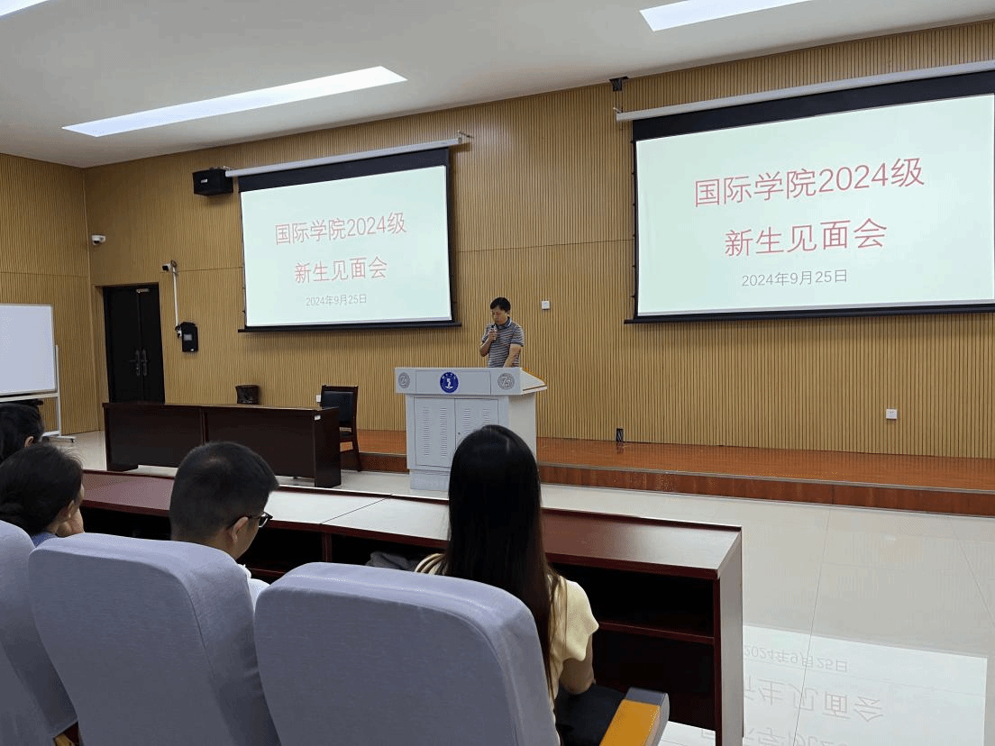 2024年9月25日晚,国际学院在博思楼一楼105室举办了2024级新生见面会。院党委书记张志会、党委副书记鲁芮汐,副院长杨芹、李谦,外语系主任胡红渊以及各教研室主任、学生科、教务科、科研科、社会服务科和党政办公室的负责人和相关老师,以及2024级全体新生参加会议。会议由学生科孙玉婷老师主持。