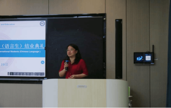 视频播放结束后,语言生班主任代表刘菊凤老师走上讲台。她的发言没有华丽辞藻,却满是“只有我们懂”的细节。她提到,为帮助学生适应异国生活,老师们不仅在课堂上逐字逐句纠正发音,更在课后陪他们就医、跑银行......。看到他们现在能用中文写作文、发朋友圈,感到无比欣慰。