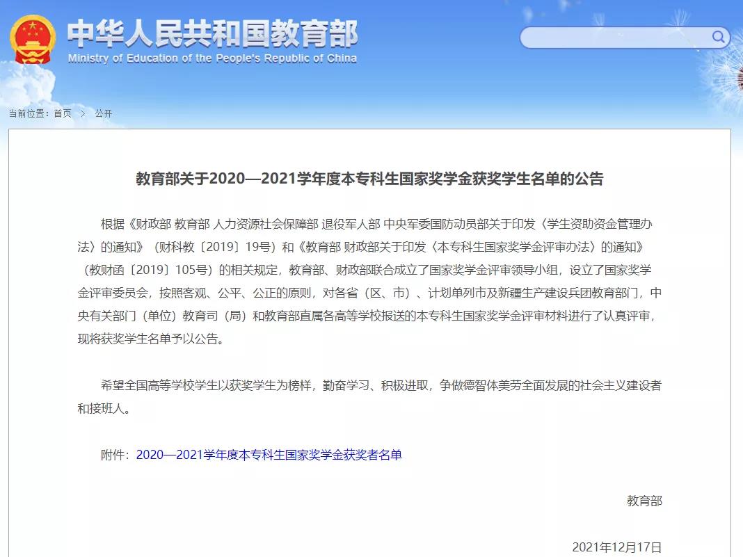 具体名单随铜铜一起来看↓↓↓ 2020—2021学年度 本专科生国家奖学金获奖学生名单 (部分名单) 祝贺