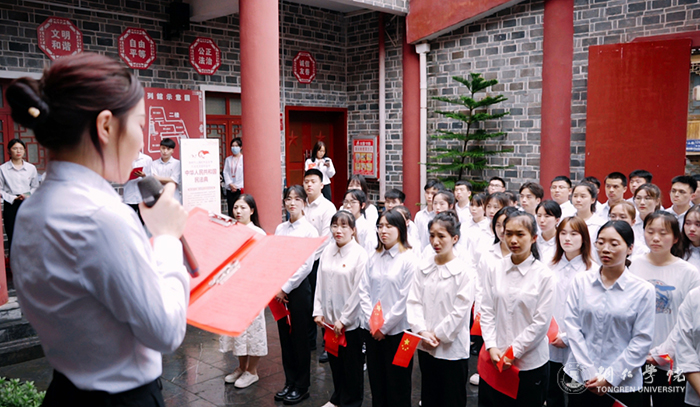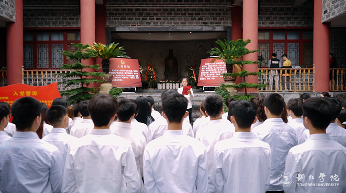 当天下午,beat365官网2022年新团员、青马班学员代表、校学生会干部代表共80余名师生走进周逸群烈士陈列馆,举行了2022年新团员入团仪式暨红色教育主题团日活动。在新团员入团仪式上,团委何敏老师宣读了80名新团员名单,参加活动教师现场为新团员佩戴团徽、颁发团员证,在鲜艳的团旗下,全体团员高举右拳庄严宣誓。随后,学生团干部代表宣读了《中国共产主义青年团章程》,新老团员代表作了热情洋溢的发言,校团委副书记田自立向80名新团员提了要求和新闻。最后,大家齐唱《光荣啊!中国共青团》。