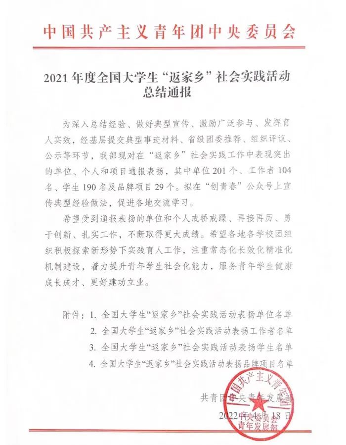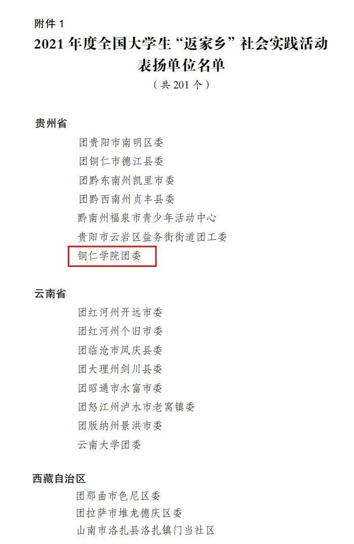 近日,共青团中央发布了2021年度大学生“返家乡”社会实践活动总结通报,对表现突出集体、个人和项目进行表扬。beat365中国唯一官网团委获评2021年度全国大学生“返家乡”社会实践活动表扬单位,也是贵州省唯一荣获此表彰的高校团委。