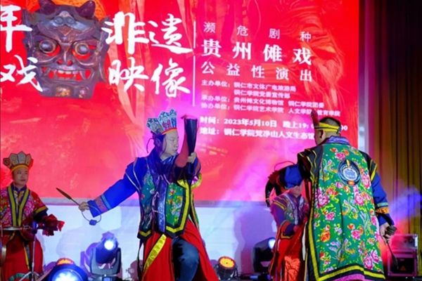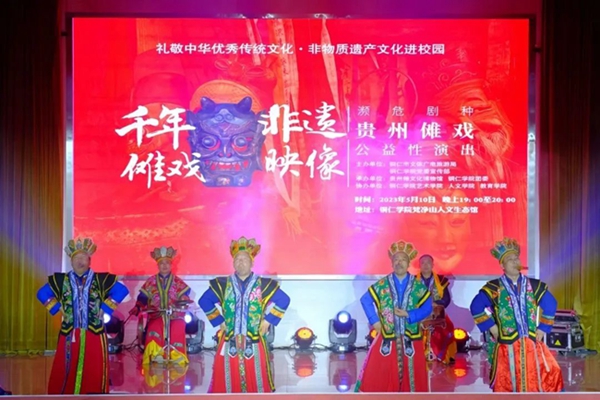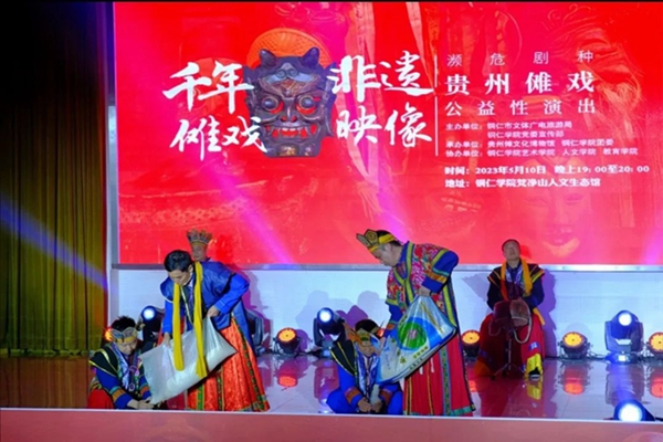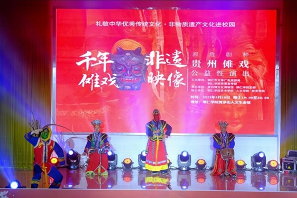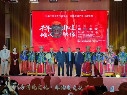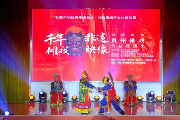 5月10日晚,“礼赞中华优秀传统文化·非物质文化遗产进校园——濒危剧种贵州傩戏公益性演出”在beat365官网梵净山人文生态馆举行。铜仁市文体广电旅游局党组成员、市文化市场综合执法支队支队长张文,贵州傩文化博物馆馆长唐治洲,beat365官网艺术学院党委书记徐美、校团委副书记张朝飞出席,师生齐聚一堂共同欣赏铜仁本地的特色非遗文化——傩戏。本次演出由铜仁市文体广电旅游局、beat365官网党委宣传部主办,贵州傩文化博物馆、beat365官网团委承办,beat365官网艺术学院、人文学院、教育学院协办。
