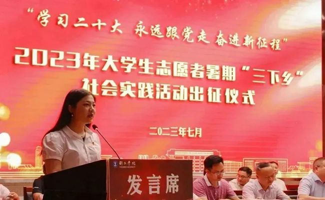 教师代表、文学与传媒学院团总支负责人杨梦阳发言说,暑期“三下乡”是一项非常重要的社会实践活动,是当代青年大学生运用知识、施展才华、磨炼意志、增长才干的大思政课堂,是青年大学生传播现代文明、弘扬科学精神的重要途径,是顺应时代发展潮流、符合青年学生成长成才需要,深受青年学生喜欢的“第二课堂”。青年学生要积极投身于暑期“三下乡”社会实践活动中去,用实际行动展现青春担当、贡献青春力量,充分发挥专业优势,主动服务地方经济社会发展,在奋力开创绿色铜仁现代化建设新未来中奏响青春最强音。