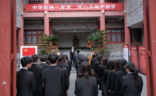 在周逸群烈士陈列馆,全体学员面向周逸群烈士塑像依次列队肃立,举行敬献花篮仪式,并向周逸群烈士塑像默哀及鞠躬,表达了对周逸群烈士的崇高敬意。第九期“青马班”副班长邓信园讲述了本次主题团日活动的目的及意义,余墨同学带领全体学员重温入团誓词。接着参观了陈列馆,在二楼聆听周逸群与贺龙初次见面、周逸群失去双亲的故事,现场开展革命传统教育,通过实地参观、讲解员声情并茂的解说,让大家重温了周逸群同志学习、工作、战斗的光辉历程,深切体会到周逸群同志坚守初心使命、自强不息、顽强拼搏的高尚品格和奉献精神。