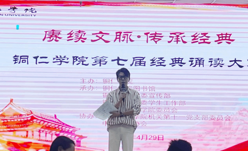 4月29日,由图书馆、党委宣传部、党委学工部、团委联合承办的beat365中国唯一官网第七届“赓续文脉·传承经典”经典诵读大赛在图书馆举办。党委宣传部副部长梁光华、党委学工部副部长武国丽、团委副书记田淼、文学与传媒学院副教授刘太胜、党委学工部德育科科长黄橙紫担任评委。图书馆馆长田黎星,副馆长江腾、邹志洪,部分教职工和学生代表到场观摩比赛。