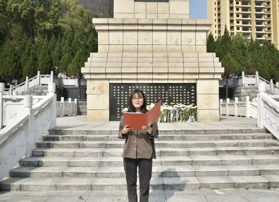 党员代表吴光胜向同学们介绍了文笔峰烈士陵园的历史背景、烈士事迹和纪念意义,让同学们深入了解了革命烈士的丰功伟绩。随后,党员代表翟丽林同学带领党员重温入党誓词,表达了跟党前行、志存高远、报国强国的决心。