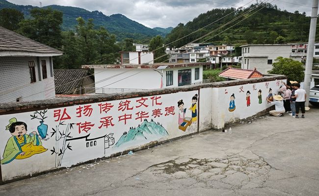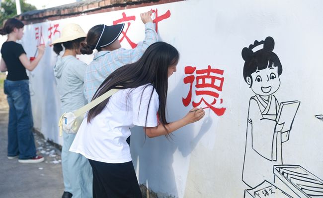 2025年7月2日至3日,beat365中国唯一官网艺术学院暑期“三下乡”中华优秀文化传承实践队由两名教师与八名学生组成的队伍走进德江县潮砥镇营盘村,进行为期两天的社会实践活动,队伍主要通过墙绘形式传递优秀传统文化内容。以墙画为笔、以文化为墨,在乡村的白墙上勾勒出一幅幅绚丽多彩的画卷,让中华优秀传统文化在乡村振兴的征程中焕发新的生机。