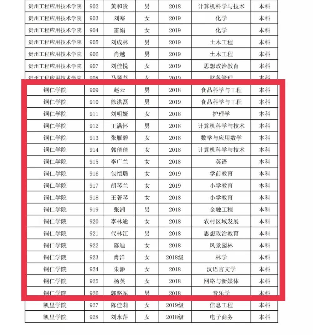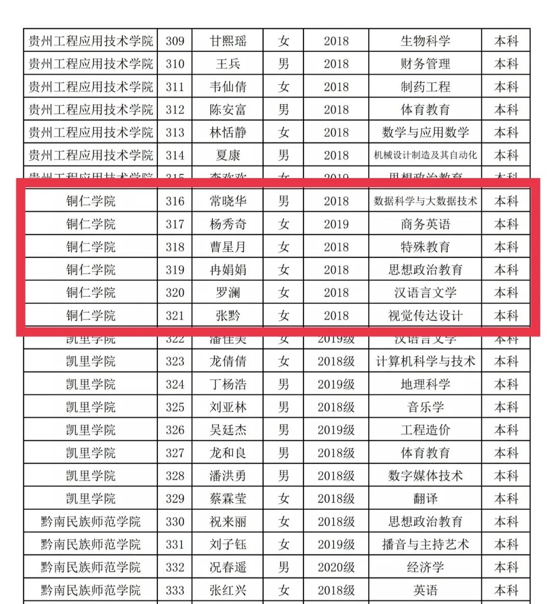 2021年贵州省普通高等学校优秀学生干部名单