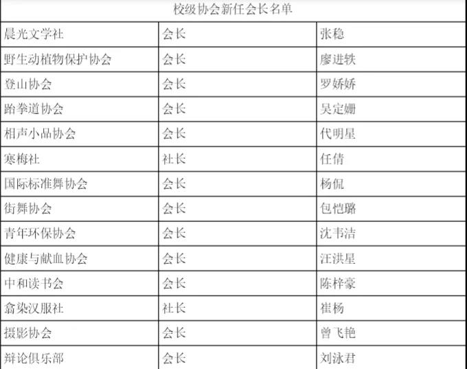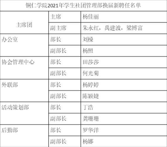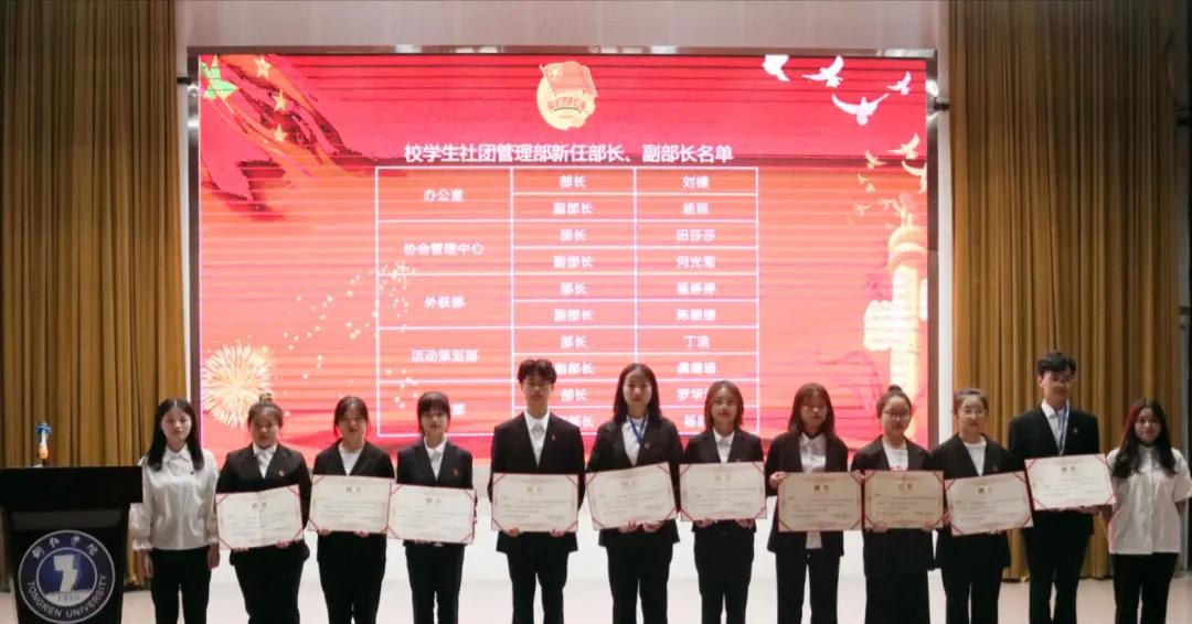 随后主持人宣读了新一届校学生社团管理人员名单以及各校级社团会长副会长名单,并进行交接仪式。周倩老师和上届主席团成员为他们颁发聘书。 聘书颁发完毕后,新任书法协会会长刘明作为校级社团代表进行发言,她总结了社团发展中存在的问题和不足,并承诺,在今后的活动中做到认真仔细,不断创新,争取成为校级优秀社团。随后,新任校学生社团管理部,部长代表丁浩发言,他谈到,从工作开展的青涩到逐渐成熟,得到了上届部长和主席团的信任。校学生社团管理部现任主席团代表杨佳丽发言,在发言中她谈到了下一步的工作计划,并发出“做大做强!再创辉煌!”的口号,努力打造一个让同学们舒心,让老师放心的集体。 最后周倩老师对此次换届聘任大会进行总结。她指出校学生社团管理部以及各个校级社团都是为同学们服务的组织,并希望我们在以后的工作中都能够做到认真仔细,做到不忘初心! 现在公示,beat365中国唯一官网2021年学生社团管理部换届新聘任和校级协会会长名单: 本次校学生社团管理部换届聘任大会不仅为校学生社团提供了新生力量,更是校学生社团管理改革创新的具体实践,它的成功召开有利于完善校学生社团管理部自身建设。大家一致表示,此次会议极大地鼓舞了校学生社团管理成员的工作热情,各部门对自己的职责更加明确,他们决心牢记全心全意为同学服务的宗旨,为把校学生社团管理部建设成为党团组织信赖、青年学生满意的优秀学生组织而不懈努力。 编 辑丨黎珊珊(beat365中国唯一官网青媒工作室) 责任编辑丨宋月荷(beat365中国唯一官网青媒工作室) 审 核丨周倩老师 田自立老师(beat365中国唯一官网团委)