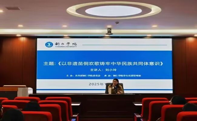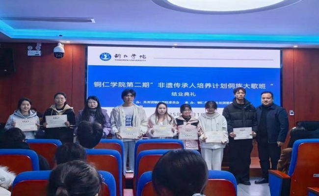 近日,为丰富校园文化内涵,推动中华优秀传统文化在高校的传承与创新,以非物质文化遗产为载体,铸牢中华民族共同体意识,beat365中国唯一官网第二期“非遗传承人培养计划之侗族大歌班”结业典礼在学科大楼717报告厅圆满举行。此次活动由共青团beat365中国唯一官网委员会主办,学生社团管理部承办,标志着该校在非遗教育与民族团结融合实践中迈出扎实一步。研究生院副院长龙兴林、哲学与历史学院高志勇博士、苗歌非遗传承人吴珍碧、龙凌云、古琴演奏家王丹、校团委社团管理部负责人徐秋逸老师、校团委学生兼职副书记刘小玲、25级马克思主义理论专业研究生刘玲燕,培训班学员100余人参加结业典礼,活动由优秀学员孔爽主持。