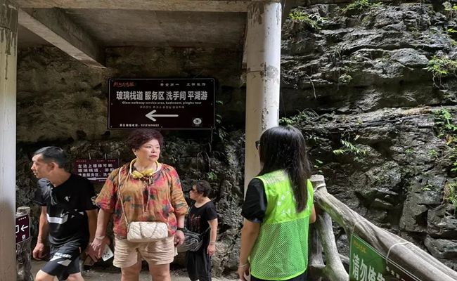 沿着蜿蜒盘旋的山路,我们来到了铜仁大峡谷景区。在了解景区基本情况后,景区负责人在景区内外为我们安排各个点位的志愿者。在景区外分别在游客服务中心、停车场、医务室都安排了志愿者看守,随后景区负责人带我们进入景区,景区内山峦峻险,河流纵横,在易出现安全隐患的地方和分岔路口,景区负责人都安排了工作人员进行看守,提醒游客注意安全以及为他们指路。