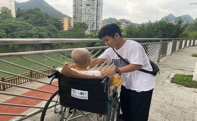 志愿者向老爷爷虚心学习