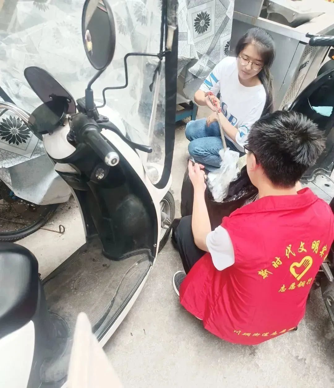 7月8日,活动正式开始,当天早晨,“环保守护先锋”小队的成员首先在学院南门集合,在清点人数之后徒步前往坞坭社区服务中心分配了小队当天所要进行的社区清洁项目,并且身着统一的环保服装,带上社区为小队准备的清扫工具前往社区各处进行清扫工作,社区领导及志愿者也积极参与其中,为大家提供指导和支持。小队两人一组,每个小组负责清扫一个特定的区域,确保整个社区得到全面清理。在清扫过程中,大家不仅清除了道路上的杂物和垃圾,还重点清理了公共区域、花坛和庭院等地方。整个环保小队相互配合,紧密合作,使整个清扫过程有条不紊,让社区焕发出了勃勃生机。