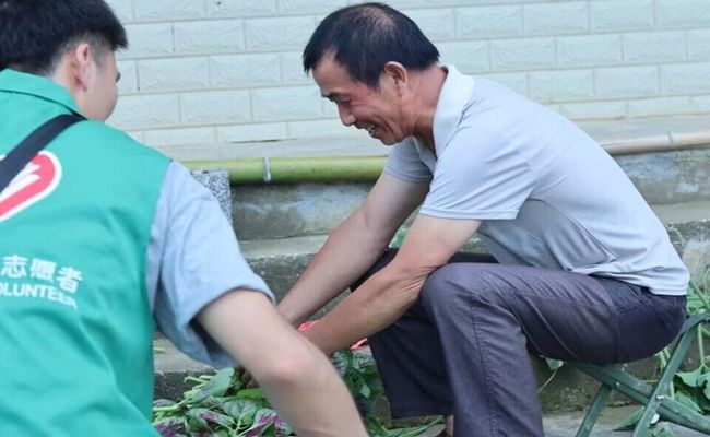 接着,志愿者们在走村入户的过程中,发现一位叔叔正在院子里选菜,在简单交流后,志愿者们热情地帮助叔叔一同选菜,叔叔也欣然介绍起手中的菜是什么、要怎样挑选以及要卖出什么价钱等等。在此过程中,志愿者们积极认真,在帮助叔叔处理好蔬菜之后,叔叔毫不吝啬地夸赞大家是好孩子,志愿者也从中了解到了农民的不易。
