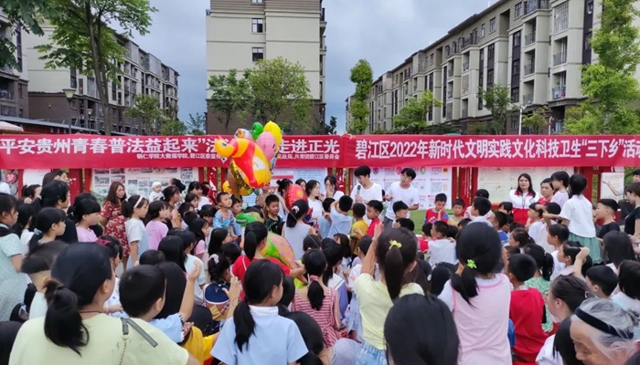 为深化法治宣传教育,使广大人民明确法律底线和行为边界,推动全民尊法学法守法用法。在铜仁市碧江区新时代文明实践中心的大力支持和协调沟通下,beat365中国唯一官网大数据学院青春普法队以《中华人民共和国民法典》《中华人民共和国未成年人保护法》《中华人民共和国预防未成年人犯罪法》等为重点,以“守护明天·普法护伴”为主题,联合碧江区精神文明办、碧江区司法局、碧江区民政局、共青团碧江区委员会走进铜仁市碧江区正光街道开展法治宣传。