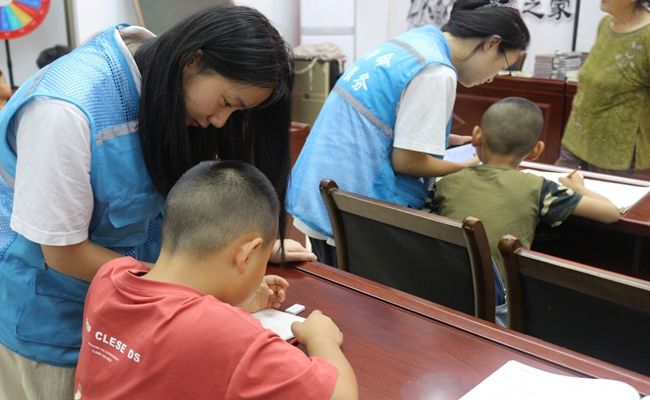 (关爱团成员为孩子们辅导功课)