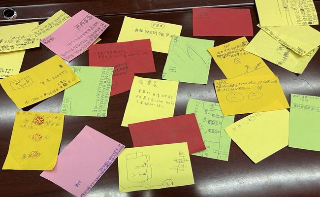 随后,星光班开展了“动手又动脑”手工课活动和“心事小纸条”心理辅导活动。手工课中,邰燕姿同学耐心地教小朋友们叠千纸鹤,一张张彩色的纸张在孩子们的巧手下逐渐变成了一只只展翅欲飞的纸鹤。"心事小纸条"心理辅导活动中,孩子们将最近遇到的不开心的事情写在小纸条上,关爱团的成员们认真阅读每一张纸条,用温暖的话语安慰孩子们,为他们提供解决问题的方案。