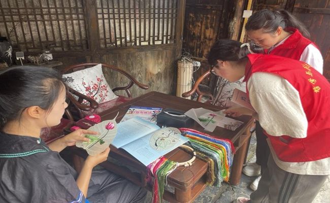 (“叶脉绣”传承者杨欣雨向队员刘思伊(左)、杜海芳(右)展示刺绣技艺)