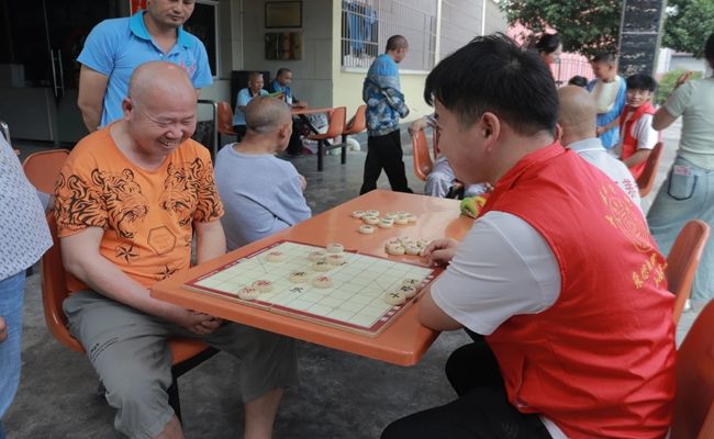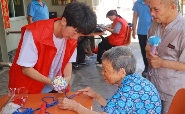 为了充实老人家的生活,志愿者们精心策划了一系列活动,包括下象棋、玩跳棋、手工制作艾草锤、打乒乓球等。在制作艾草锤的过程中,志愿者们耐心教授,与老人们一同动手。一缠一绕间,尽显对细节的呵护;一紧一实间,流露出对成品的期待。随着艾草锤的逐渐成型,老人们的脸上也流露出了满足的笑容。