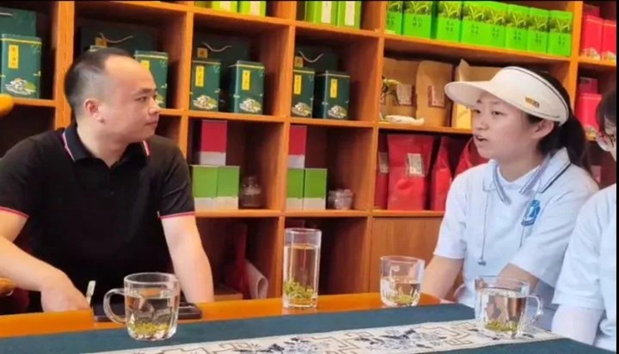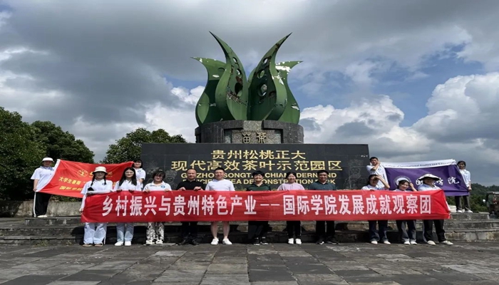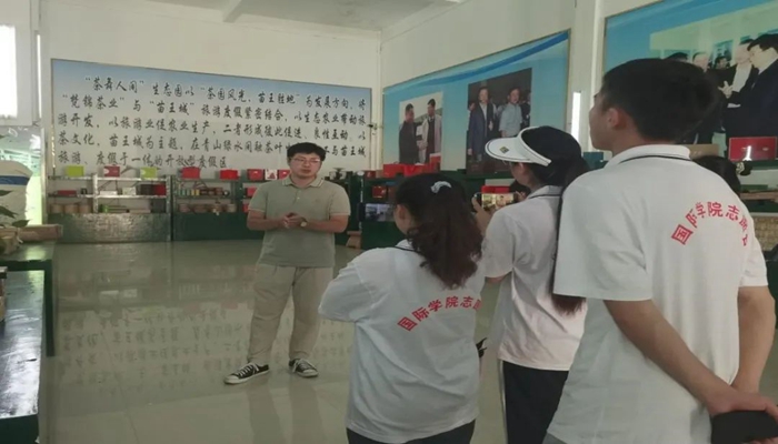 为深入学习习近平新时代中国特色社会主义思想,贯彻习近平总书记在庆祝中国共产主义青年团成立100周年大会上的重要讲话精神,引导和帮助广大青年学生与现实相结合的“大思政课”,在社会课堂中“受教育、长才干、作贡献”,坚定信念听党话、跟党走,以实际行动迎接党的二十大胜利召开。beat365官网暑期“三下乡”国际学院发展成就观察团以乡村振兴与贵州特色产业发展为立足点,在铜一茶业董事长蒋玉屏女士、铜一茶业副总经理张鹏先生及指导老师周倩的带领下,来到铜一茶业的正大万亩茶园、生产茶厂、铜一茶店等地进行调研学习。