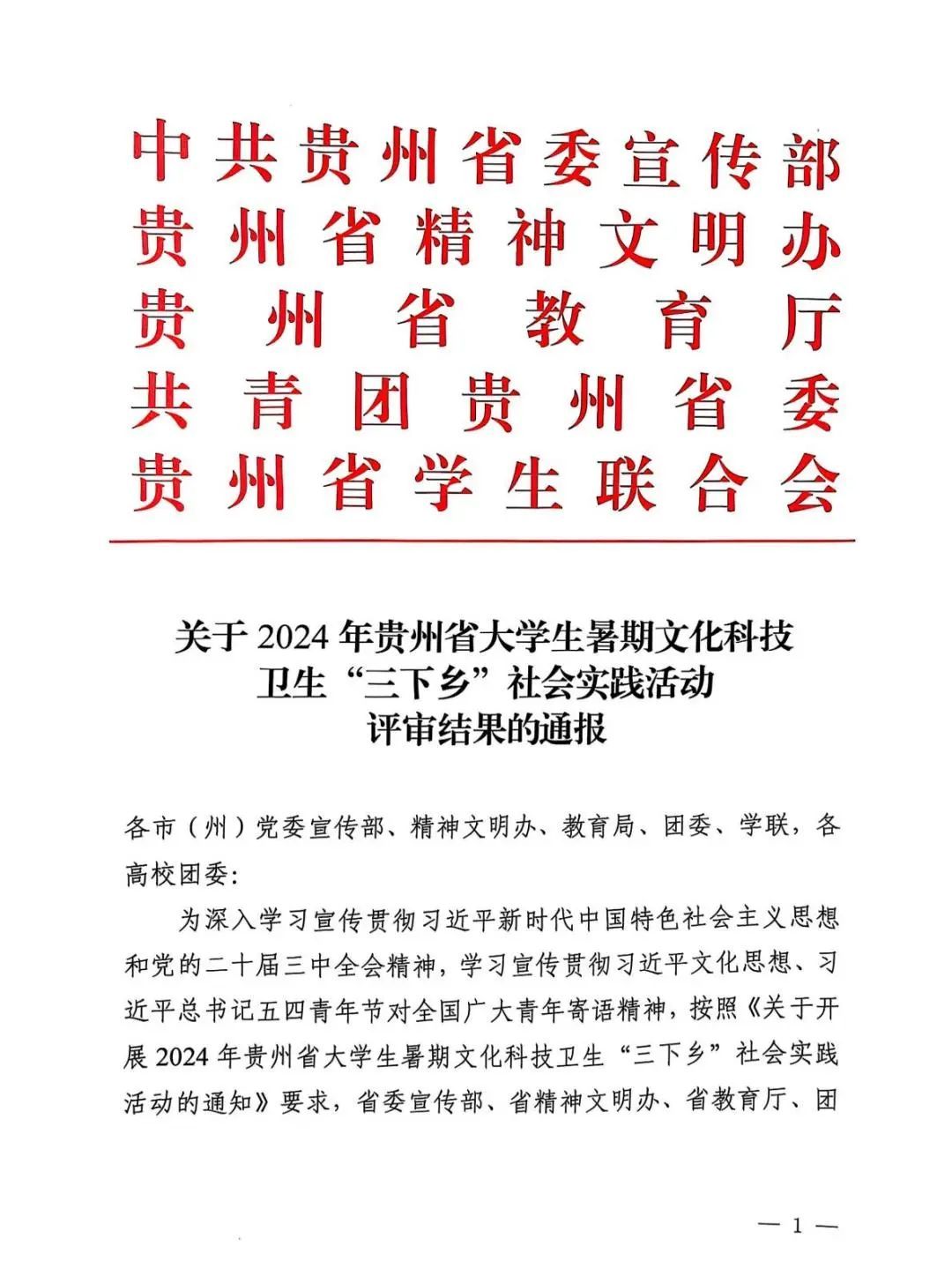 近日,省委宣传部、省精神文明办、省教育厅、团省委、省学联等部门联合印发了《关于2024年贵州省大学生暑期文化科技卫生“三下乡”社会实践活动评审结果的通报》,通报了在活动中涌现出来的先进集体、优秀团队和个人。beat365官网学子积极投身实践,表现突出,喜获表彰79项,其中优秀实践单位6个、优秀实践团队36支、优秀个人36名、优秀品牌项目1个。