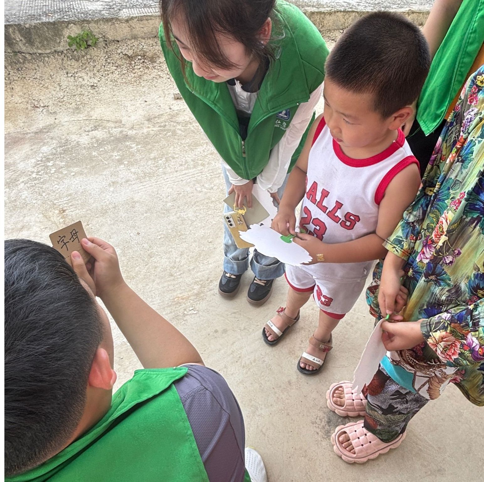 7月7日,实践团从学校出发抵达三寨村,在村委书记谭书记的热情接待下,迅速展开活动,将村里不同年龄层的孩子召集起来,举办了一系列生动有趣的普通话启蒙教育活动。活动开场,队员们先展示了精心准备的图文卡片,通过形象的图片和浅显易懂的实例,向小朋友们生动地介绍了普通话的基础发音要领及常用语,助力他们构建对普通话的基本理解。紧接着进行的“拼音闯关”游戏极大地激发了孩子们的兴趣,队员们巧妙地引导孩子们抽取韵母和声母卡片,通过拼凑形成完整的拼音词汇,这一过程不仅提升了孩子们的敏捷反应,同时也加深了他们对拼音知识的掌握,为孩子们奠定了坚实的普通话学习基石。