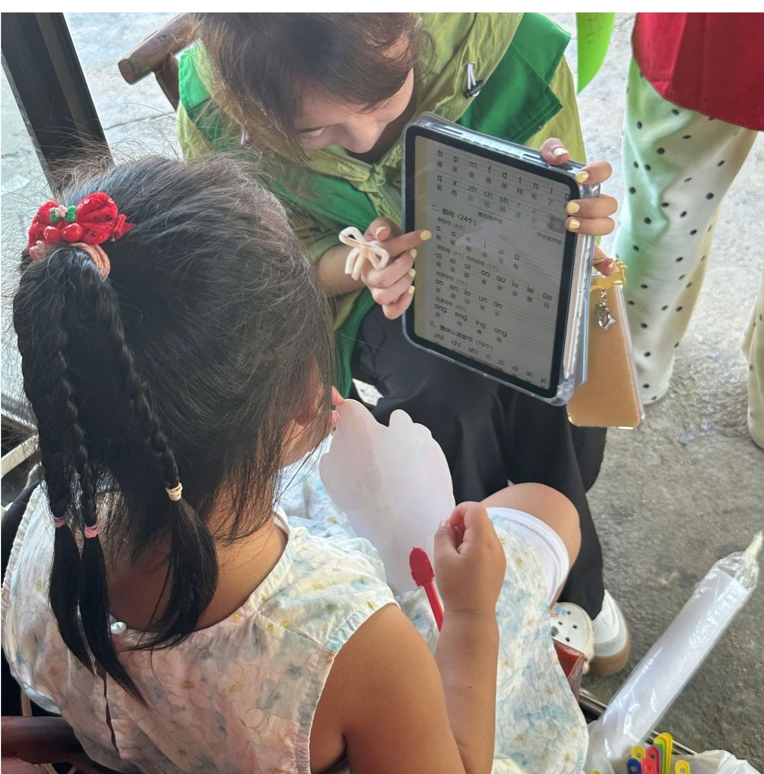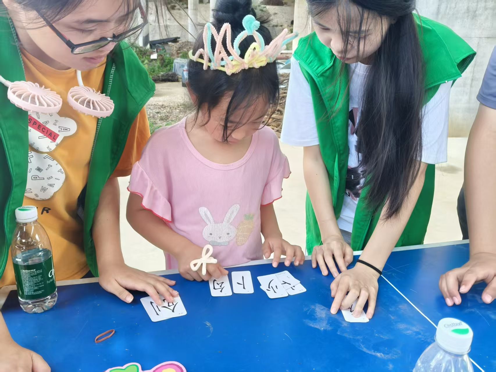 带着首日活动的良好反响,实践团队于7月8日持续展开游戏互动,以增进知识的普及。当日,活动以“词语接龙”、“绕口令挑战”及“汉字书写”作为核心环节:在“词语接龙”环节中,队员们选定主题,孩子们依次连贯相关词语,在愉悦的氛围里丰富词汇、规范发音;在“绕口令挑战”环节,挑选了贴近孩子的绕口令,队员先行示范,随后指导孩子们逐句练习,及时纠正发音不准确之处,现场气氛活跃;“汉字书写”环节则通过“听音写词”与“拼字匹配”两种游戏形式,提高了孩子们对汉字的辨识能力,队员们还针对性地指导笔画顺序和字形结构,助力孩子们规范掌握汉语的运用。