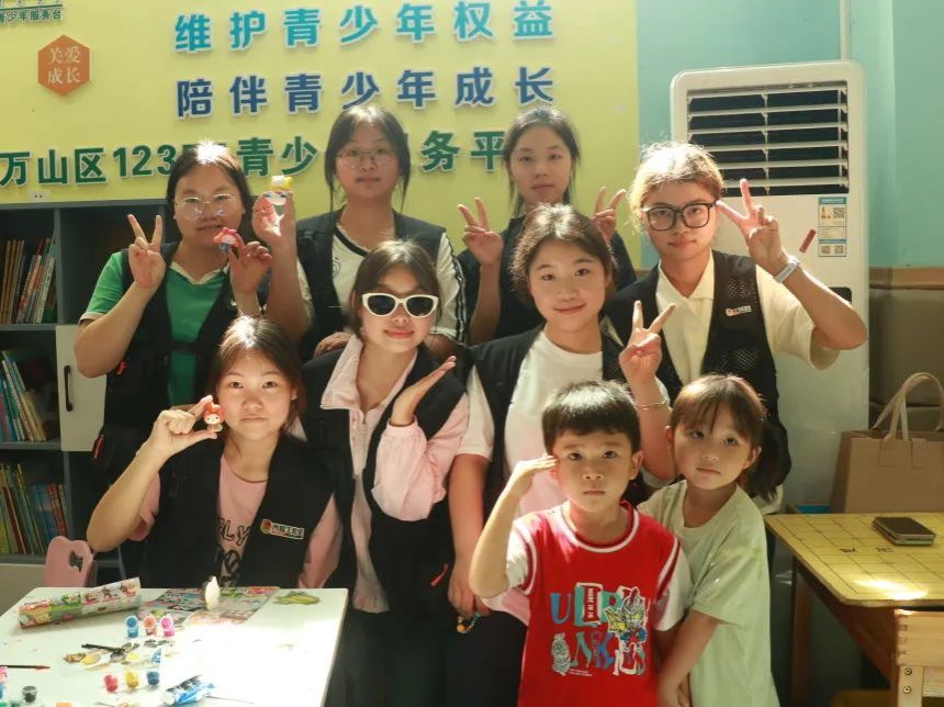PPT讲解结束后,在社区工作者的带领下,孩子们与队员们一同前往“儿童之家”开展手绘石膏娃娃活动。队员们分组行动,一边架设拍摄设备记录活动瞬间,一边陪伴孩子们创作。