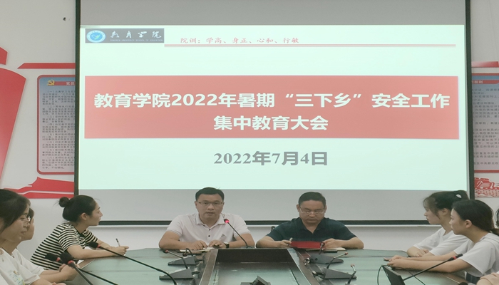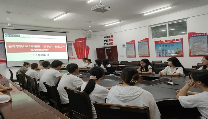 为扎实推进2022年暑期“三下乡”实践活动走深走实,强化学生社会实践安全意识,教育学院2022年7月4日于明理楼B三楼会议室召开“三下乡”安全培训会议。教育学院党委书记崔德虎、副书记吴承品,教育学院团总支负责人全丹妮出席本次会议,参会人员为教育学院“三下乡”实践团队全体成员。
