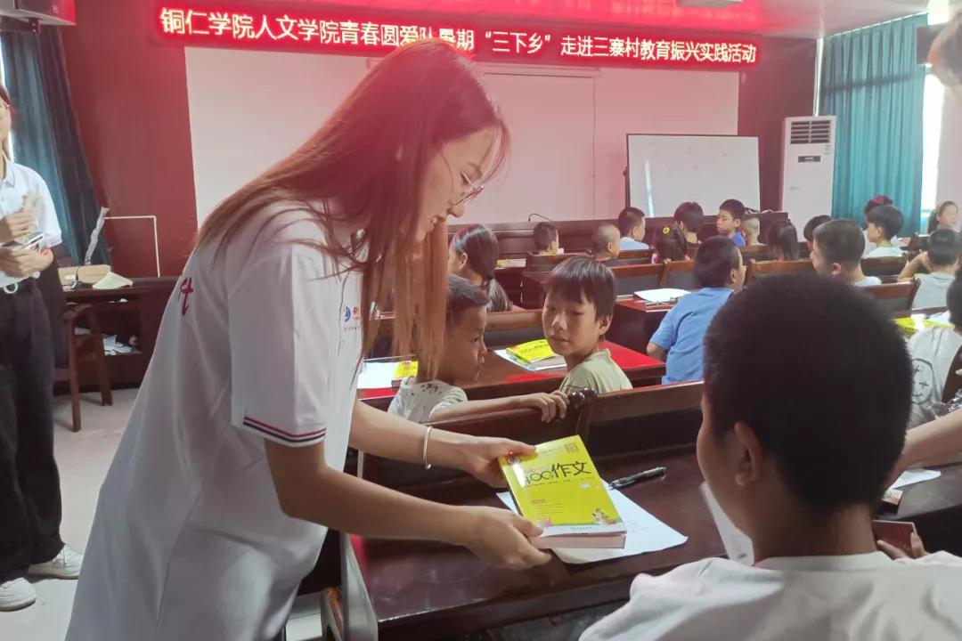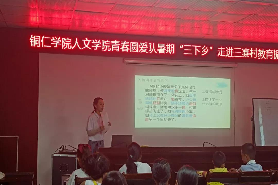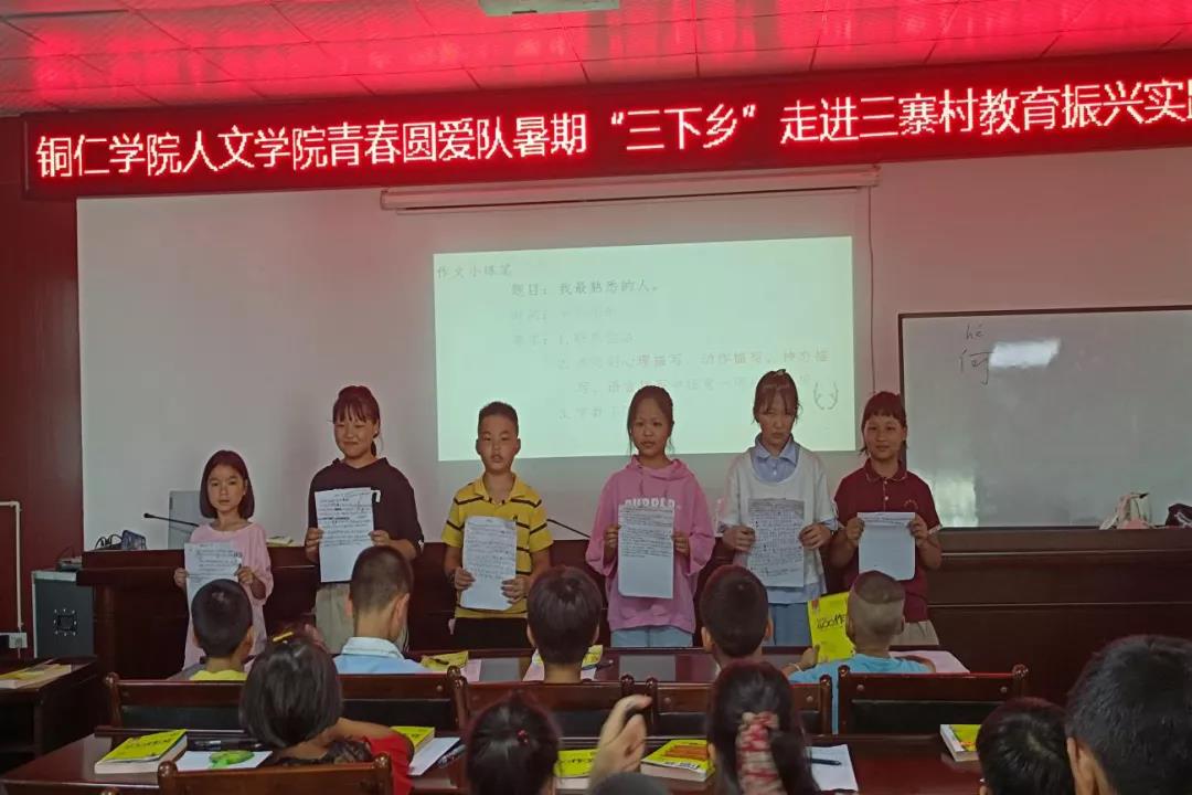 7月24日,人文学院青春圆爱队前往碧江区正光街道三寨村开展暑期“三下乡”社会实践活动之写作课堂教学。此次活动由人文学院团总支书记赵娟带队,10名志愿者同行。碧江区正光街道60余位学生参加此次暑期实践活动,由志愿者何思雨主讲此次教学活动。 在教学活动开始前,志愿者给参加此次写作课堂的60余名小朋友发放了写作书。发放完毕后,何思雨向小朋友们自我介绍,同时利用课堂小游戏与小朋友们互动,拉近和小朋友们之间的距离,调动小朋友们的积极性并为后续课堂教学打下基础。 (志愿者发放写作书) 课上,何思雨给小朋友们讲解了写作时运用的描写和一些注意事项,她说,写作是让我们对日常的事进行描述,并进行思考,把思考结果变成文字留存。讲解完毕后,她针对写作的技巧与方法对小朋友们进行一一解答。 (主讲人何思雨) 她在上课时,利用一些小短文例子让小朋友更加深刻的了解写作的方法与技巧,并随机邀请小朋友朗读小短文。同时,让小朋友在小短文中找到运用了哪些描写手法。最后,何思雨采取课堂现场写作的方式结束了此次课堂,小朋友们都非常认真地对待这次写作。写作完成后,何思雨随机抽选小朋友上台把自己的作文朗读给大家听,小朋友们积极举手上台,现场气氛十分融洽。 (互动现场) 何思雨表示,文章的力量是不可估量的,写作可以带来感动。同时,写作对于我们还有更重要的意义,想要展示自我时,最有说服力的手段莫过于写作。写得一手好文章,可提升自己的说服能力,提高语言的表达能力,进而能提高与人交际的能力,对学习其他学科也都大有裨益。 (小朋友朗读自己的作文) (作文展示) 此次活动为学生提供了展示自我的平台,极大地促进了学生学习写作的积极性,培养了小朋友的即兴写作兴趣及写作能力。小朋友们纷纷表示,此次写作课的开展让自己也收获了许多写作技巧,并十分期待后续的活动。 来 源丨beat365中国唯一官网人文学院 编 辑丨吴凯霞(beat365中国唯一官网青媒工作室) 一 审 |赵娟老师(人文学院) 终 审丨田自立(beat365中国唯一官网团委)