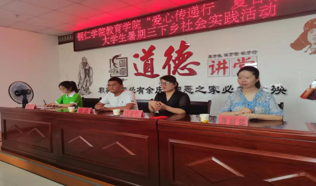 2021年7月22日上午,教育学院暑期“三下乡”社会实践队在打角冲安置区道德讲堂举行“三下乡”社会实践活动的启动仪式。出席启动仪式的有打角冲社区团支部书记杜磊、铜仁市碧江区职业技术学校四点半课堂负责人蒋丽蓉、教育学院带队老师钱丽红以及参加此次实践活动的所有志愿者们和社区的孩子们。启动仪式上,三位负责人都纷纷表示此次活动非常有意义,希望通过此次活动能够让社区的孩子们有所收获,帮助孩子们度过一个愉快而有意义的假期。