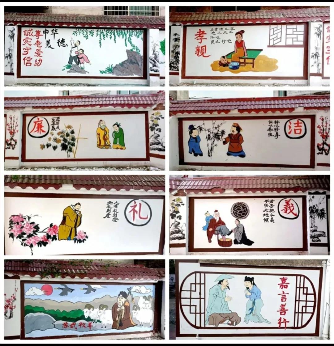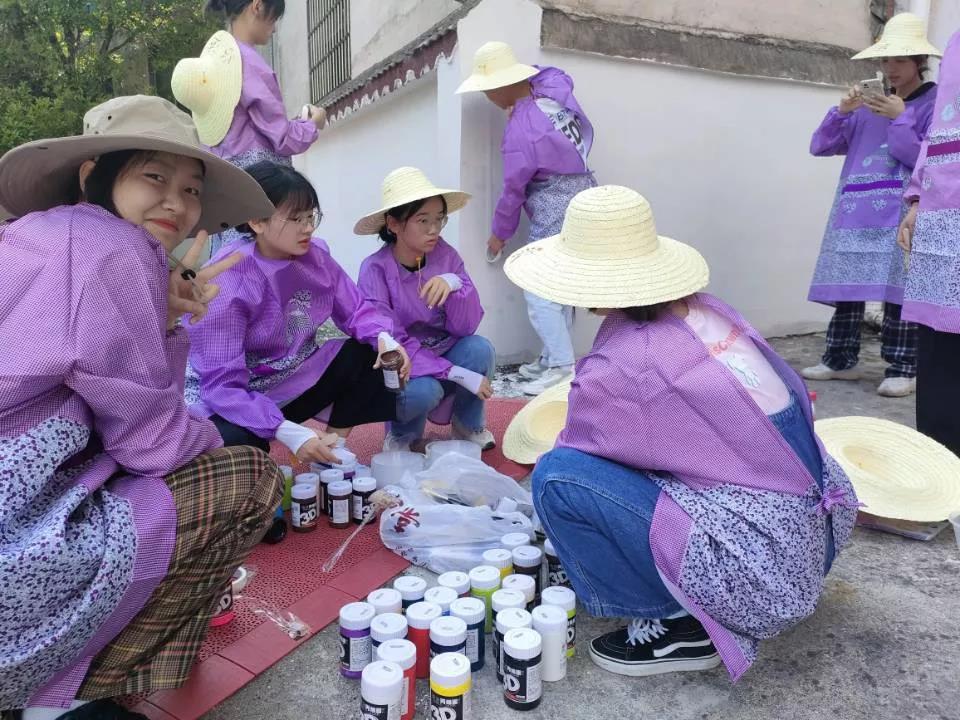 在墙画绘制现场,实践队员们明确分工、团结协作,围绕礼、义、廉、洁以及美丽乡村、成语故事等主题,先后完成了数十幅构思巧妙、生动形象的墙绘作品,为村容村貌注入新活力。由于墙绘采用的是丙烯颜料,清洗难度较大,实践队员们衣服上、头发上粘上颜料无可避免,加上天气时而下雨时而烈日,但是他们没有退缩,用自身过硬的专业能力完成了绘制任务,为美丽乡村建设贡献一份力量。