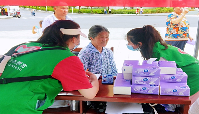 在活动现场,志愿者们分工明确,为来询问的老人家倒水、给需要帮助的老人家相关信息记录下来、为路过的老人家宣讲安全知识……志愿者们都忙得不亦乐乎。在与老人交流分享的过程中,老人们的脸上都露出了真挚的笑容。在宣讲结束后,小队开展了“助力强身健体”的广场舞活动,伴随着音乐节奏的律动,志愿者带领围观的老人和孩子一起载歌载舞,舞蹈结束之后志愿者们给现场老人送上祝福合影留念的同时,送上了纸巾和三宝锤等小礼品。