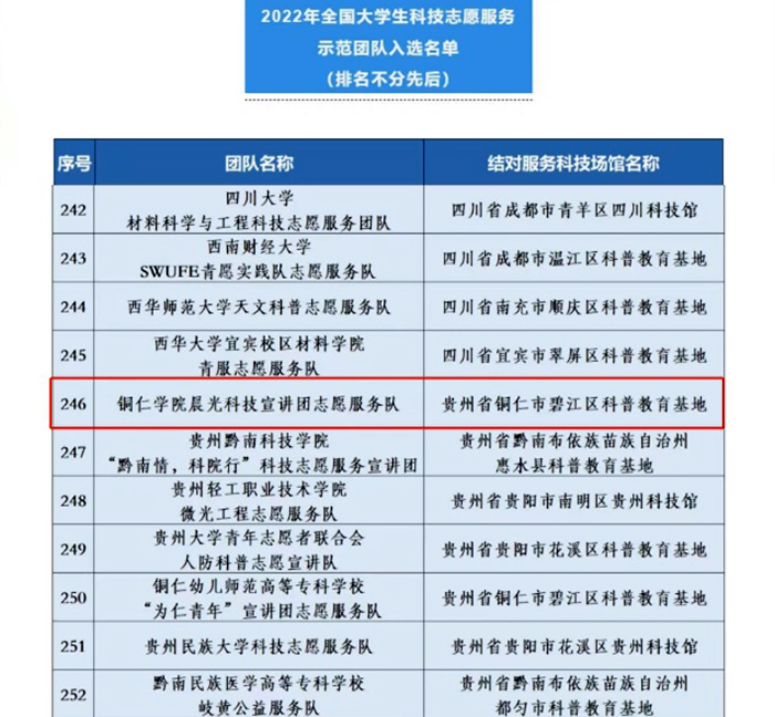 1110日,全国大学生科技志愿服务示范团队遴选活动正式公布入选结果,贵州省共有7支队伍入选,beat365中国唯一官网晨光科技宣讲团志愿服务队名列其中这是beat365官网校园文化社团获得的又一殊荣