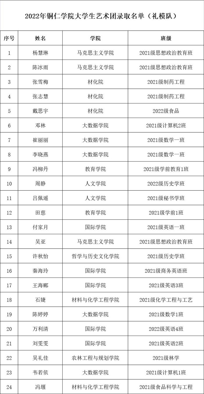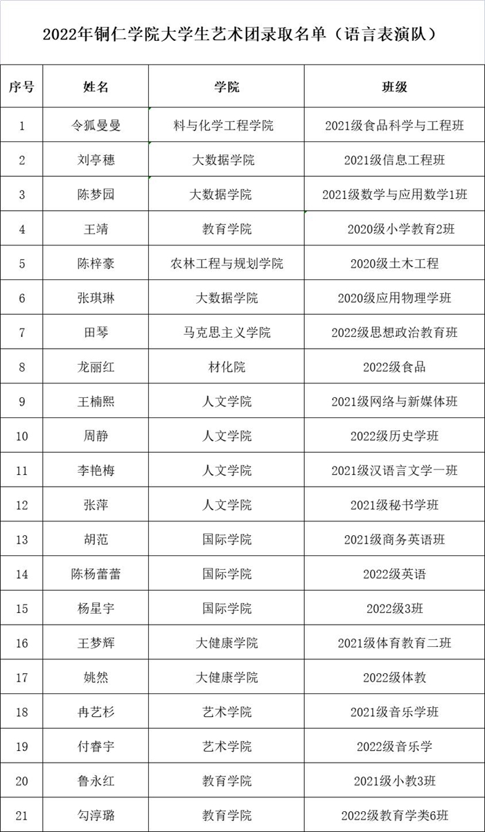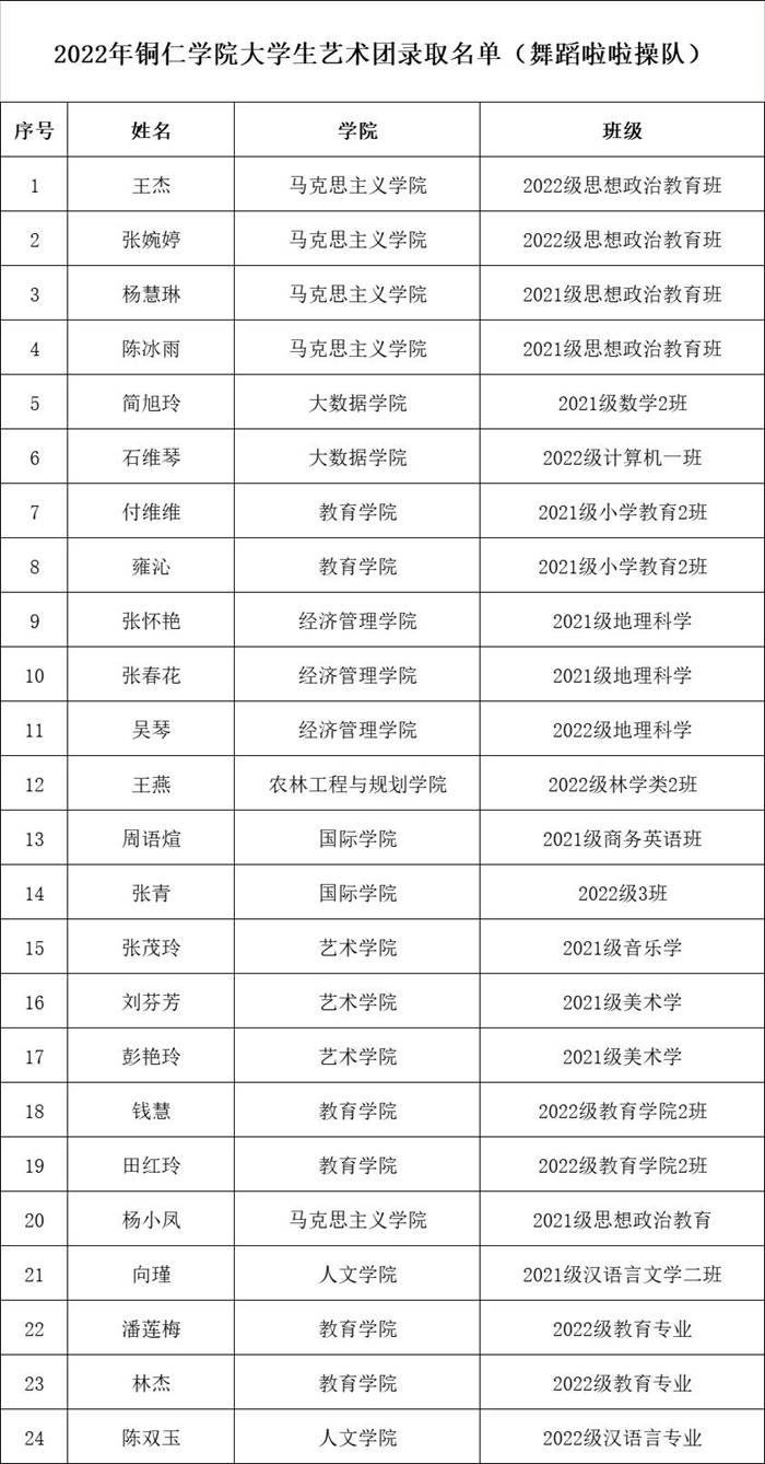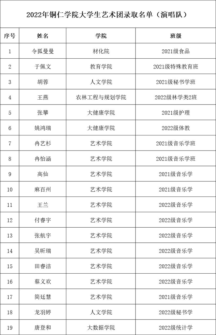 近期,beat365官网大学生艺术团招新工作圆满完成。经过学生自主报名、各院推荐报名等多种方式,招募语言艺术、舞蹈啦啦操、礼模、演唱等艺术爱好者,共210人报名,最终由艺术团指导教师及专业教师进行面试考核选拔,共有84名同学脱颖而出,现将录取名单予以公告(排名顺序不分先后)。