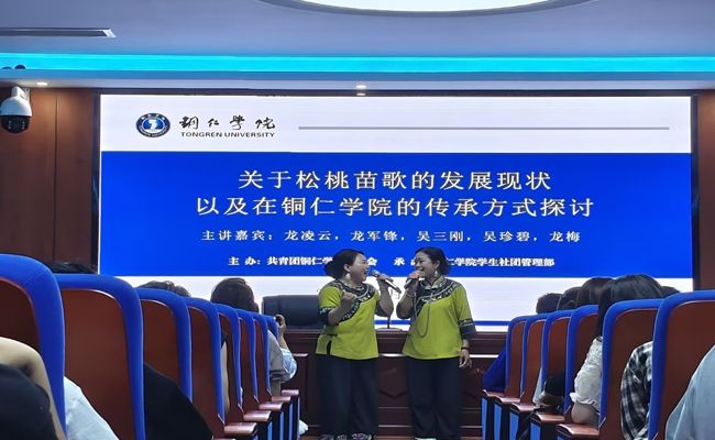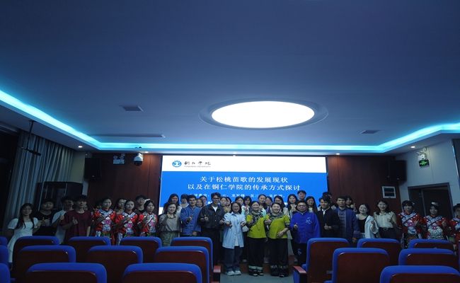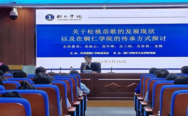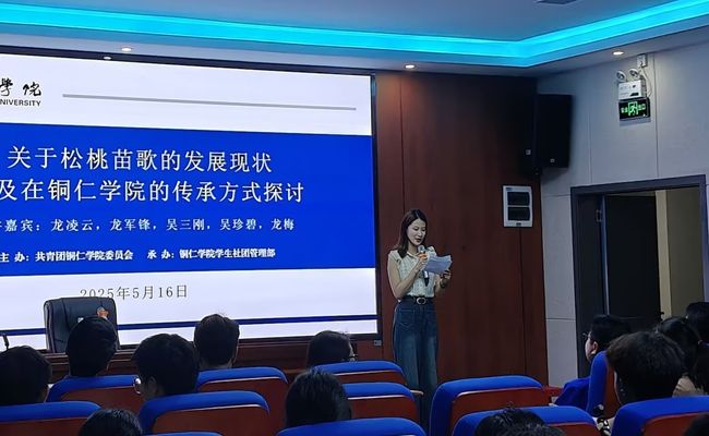 为传承“非遗”民族文化,在高校培养苗歌传承人,打造beat365中国唯一官网社团“非遗”文化特色,同时鼓励本校研究生参与学习以促进跨学科融合的创新性发展,起到地方高校服务于地方民族文化建设的作用,赋予“非遗”民族文化新时代的生命力。2025年5月16日下午7点,由共青团beat365中国唯一官网委员会主办,beat365中国唯一官网学生社团管理部承办的“非遗”苗歌传承人培养计划之“关于松桃苗歌的发展现状以及在beat365中国唯一官网的传承方式探讨”主题讲座,在学科楼717报告厅举行。参加此次讲座的领导和老师有beat365中国唯一官网艺术学院党委副书记麻晔斐教授、beat365中国唯一官网团委副书记田淼老师、beat365中国唯一官网党政办科长龙黎老师、beat365中国唯一官网乌江学院尹恒老师、beat365中国唯一官网团委学生社团管理部负责人徐秋逸老师。此次讲座特邀本土苗歌传承人主讲团走进高校开讲,分别是来自松桃苗族自治县苗歌协会的龙梅老师、龙凌云老师、龙军锋老师、吴三刚老师以及吴珍碧老师。讲座由23级马克思主义理论的研究生邱译萱同学主持。