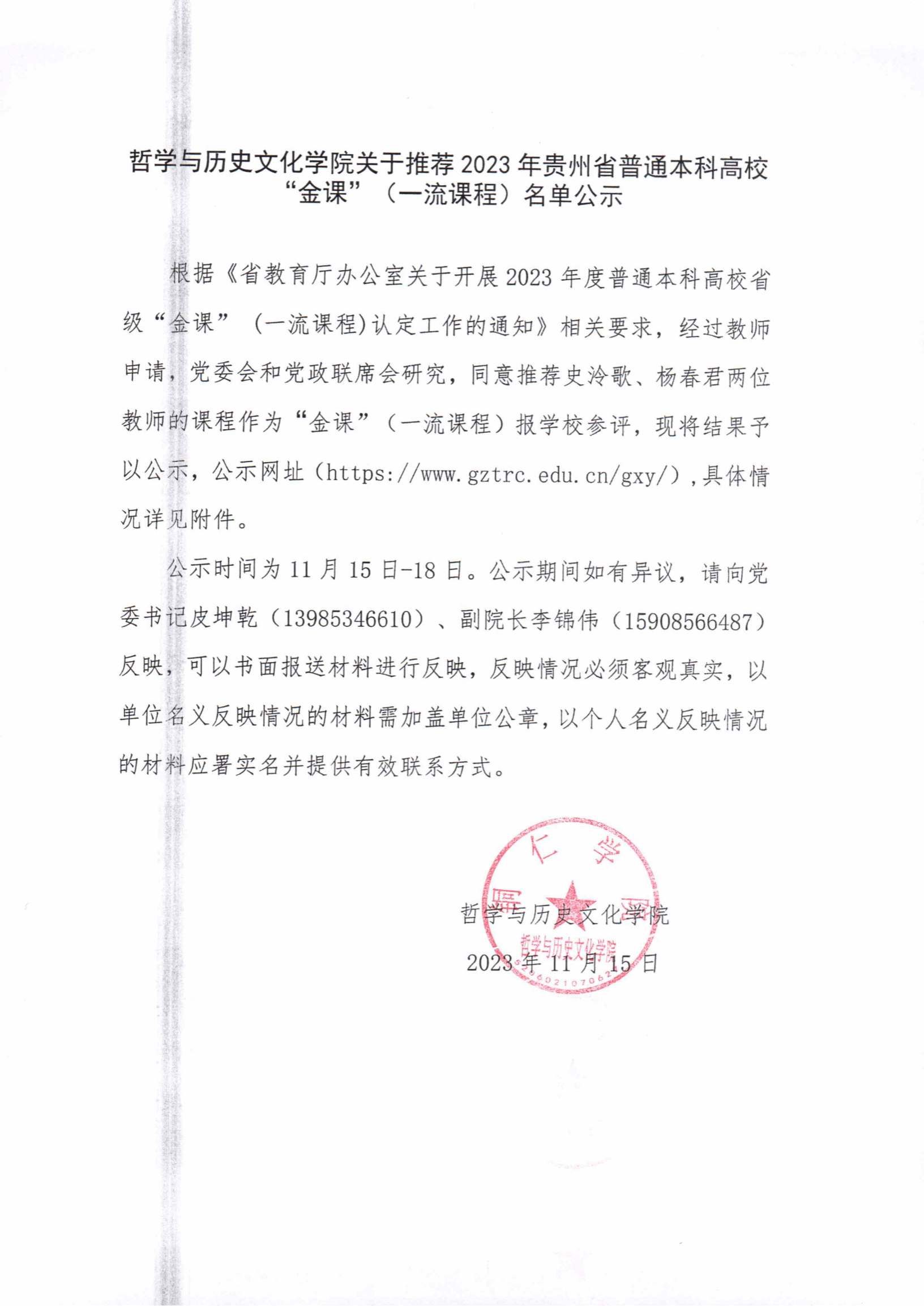 根据《省教育厅办公室关于开展2023年度普通本科高校省级“金课” (一流课程)认定工作的通知》相关要求,经过教师申请,党委会和党政联席会研究,同意推荐史泠歌、杨春君两位教师的课程作为“金课”(一流课程)报学校参评,现将结果予以公示,公示网址(/gxy/),具体情况详见附件。