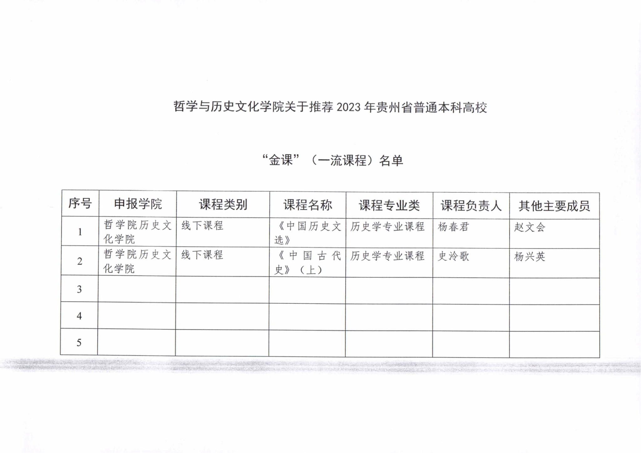 1 | 哲学院历史文化学院 | 线下课程 | 《中国历史文选》 | 历史学专业课程 | 杨春君 | 赵文会 |