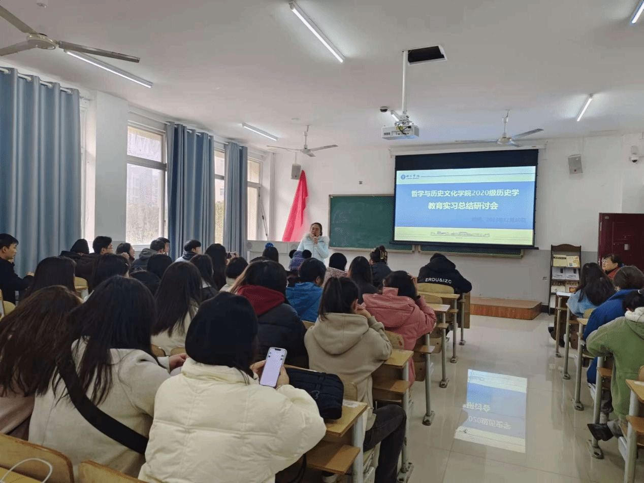 2024年1月2 日上午,哲学与历史文化学院在依仁楼A102召开2020级教育实习总结研讨会。副院长杨峻岭、实习带队教师龙智先以及2020级历史学全体学生参加了本次会议。本学期,2020级历史学专业学生32人分别在铜仁附中、九中、松桃县群希实验学校等10所学校进行了为期四个月的教育实习。在总结会上,10个实习小组组长分别汇报了各个实习学校的实习经历和心得体会。经过四个月的学习和锻炼,同学们在知识积累和实践能力方面均取得了长足的进步。同时,他们深深感受到当代大学生不仅应努力加强自身专业知识和技能的学习,更重要的是应不断提高自身的综合素质和能力、学会如何做人和做事。两个小时的汇报,全场多次响起热烈的掌声。带队教师代表龙智先老师针对实习过程中的教学教法、工作态度、课程设置等问题进行了归纳总结,并对今后的实习工作提出了建设性建议。杨峻岭副院长对实习工作给予肯定和认可,并希望同学们在今后的学习生活中取长补短,不断完善和充实自己,争取更大进步。教育实习近平总书记结研讨会的成功举办,意味着本学期我院教育实习工作的圆满结束。通过这次实习,同学们收获满满,不仅提高了教学水平,也锻炼了团队协作和沟通能力,对教师职业有了更加深刻的认识。非常期待同学们未来在教育领域取得更大的成就。