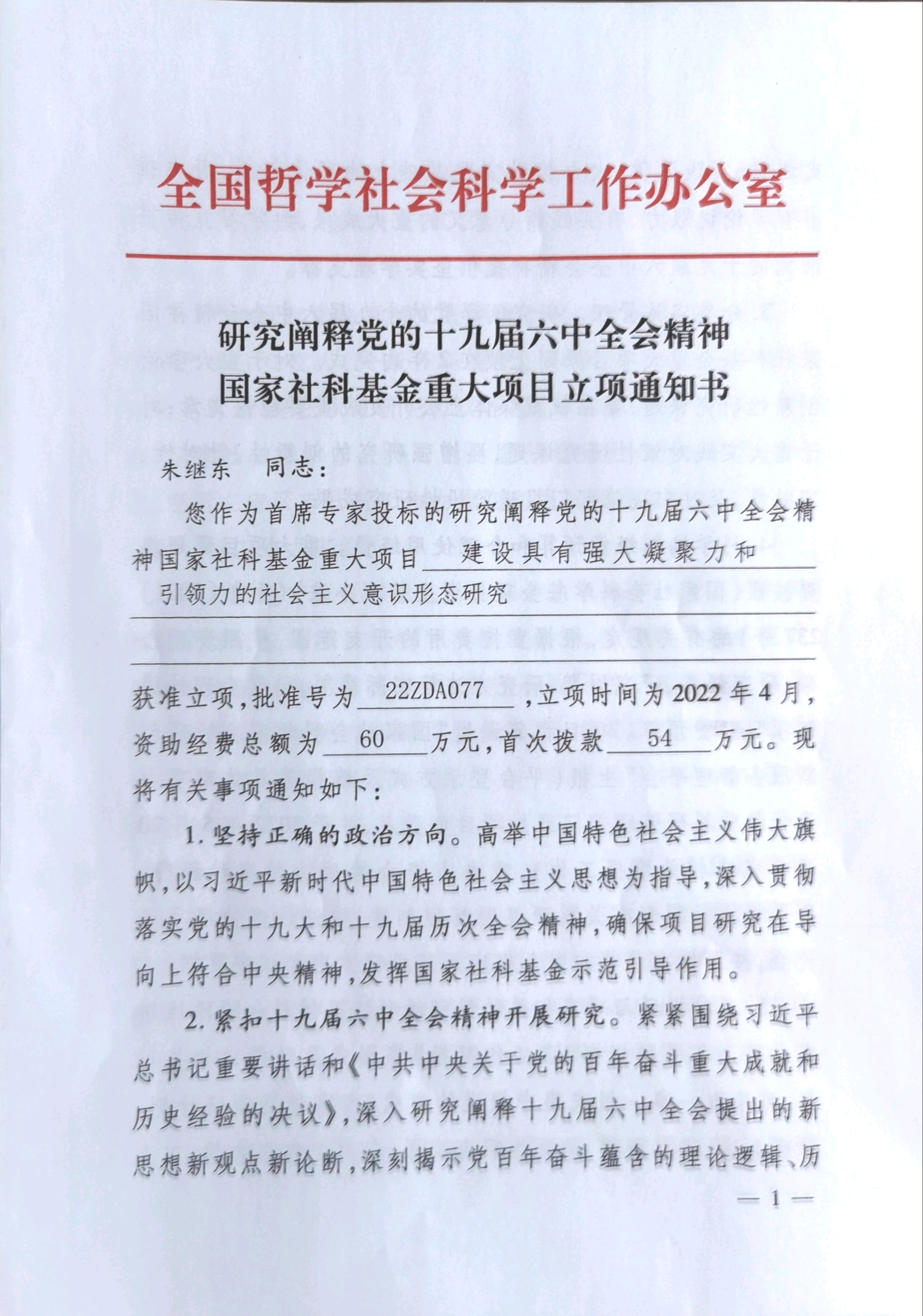 由中国社会科学院马克思主义研究院朱继东研究员为首席专家、beat365官网皮坤乾教授等为子课题负责人申报的《建设具有强大凝聚力和引领力的社会主义意识形态研究》(课题编号:22ZDA77)顺利获批。本课题共有五个子课题,分别为《建设具有强大凝聚力和引领力的社会主义意识形态面临的主要挑战研究》《新时代社会主义意识形态建设的历史性巨变和主要经验研究》《努力建设具有强大凝聚力和引领力的学科体系、学术体系、话语体系研究》《网络主战场主阵地与建设具有强大凝聚力和引领力的社会主义意识形态研究》《建设具有强大凝聚力和引领力的社会主义意识形态的科学路径研究》。皮坤乾教授负责的子课题为《建设具有强大凝聚力和引领力的社会主义意识形态的科学路径研究》,子课题成员为beat365官网马克思主义学院符长喜、袁记平、刘铮、田建龙、陈开敏、宣杰六位博士和教育学院杨秀琴教授等。