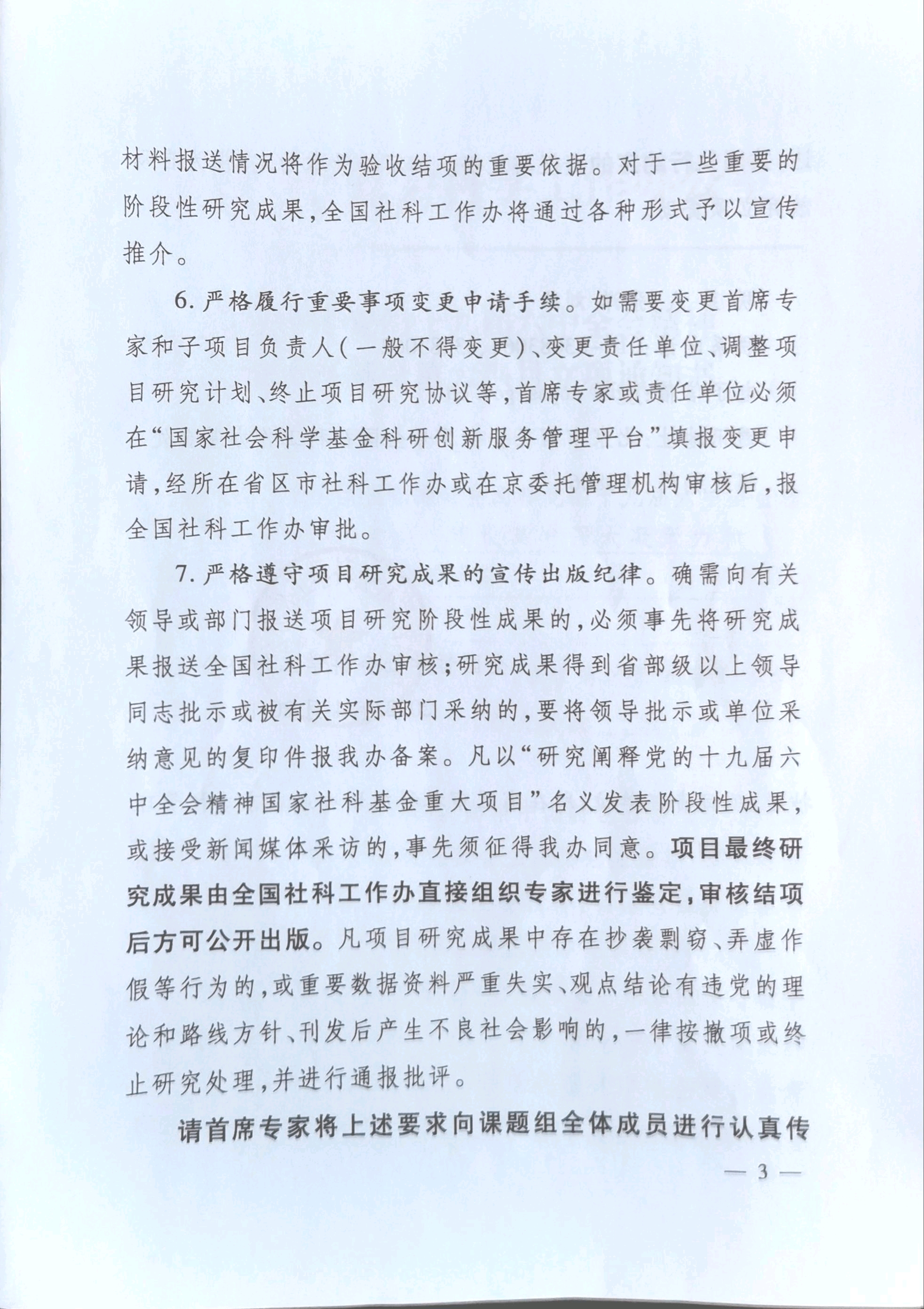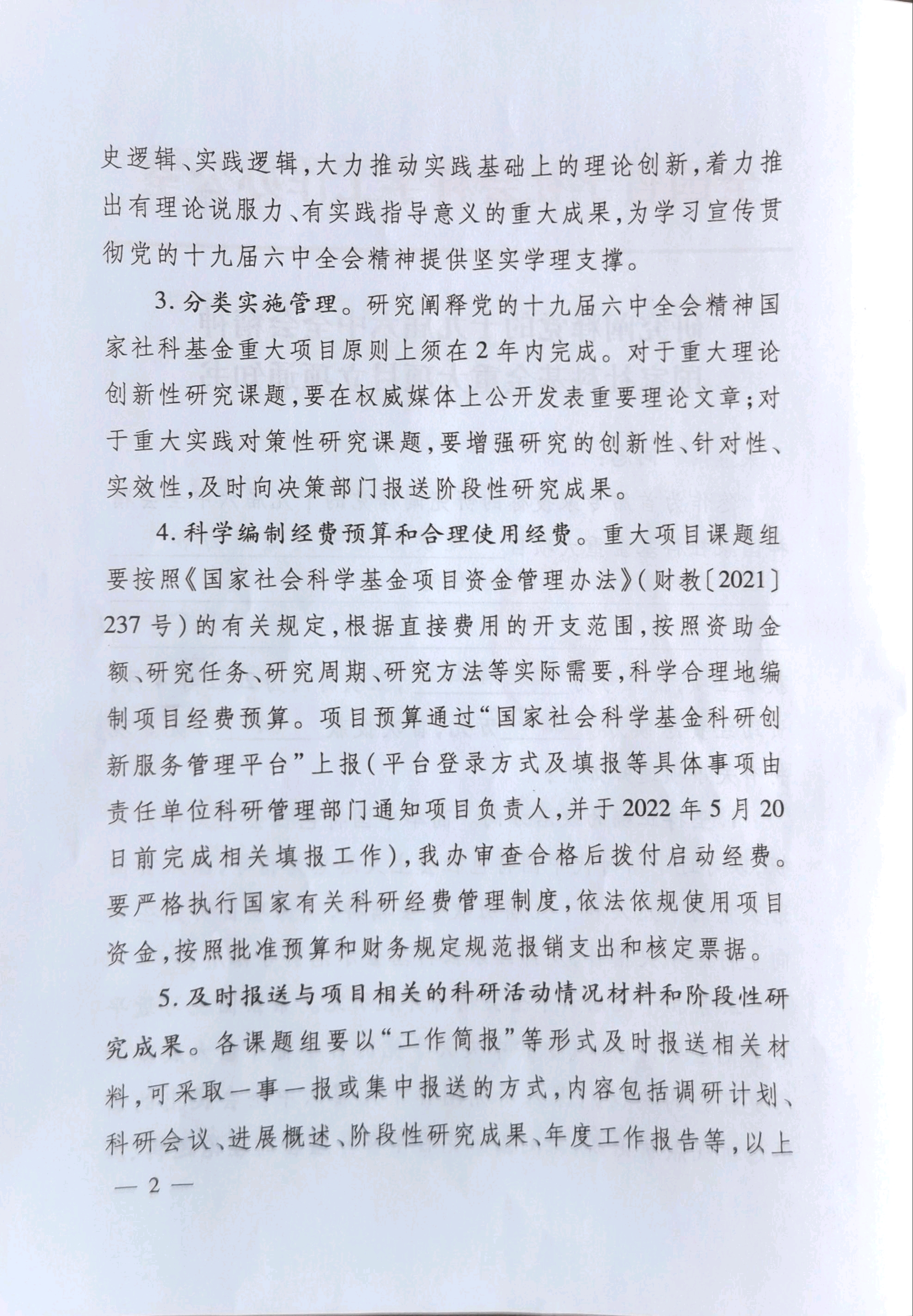 国家社科基金重大项目是国家哲学社会科学研究领域层次最高、资助力度最大、权威性最强、竞争最为激烈的项目类别。此次“研究阐释党的十九届六中全会精神国家社科基金重大项目”面向全国公开招标,共立项课题130项。立项课题以习近平新时代中国特色社会主义思想为指导,深入贯彻落实党的十九大和十九届二中、三中、四中、五中、六中全会精神,紧紧围绕习近平总书记重要讲话和《中共中央关于党的百年奋斗重大成就和历史经验的决议》,深入研究阐释十九届六中全会提出的新思想新观点新论断,深刻揭示党百年奋斗蕴含的理论逻辑、历史逻辑、实践逻辑,大力推动实践基础上的理论创新,着力推出有理论说服力、有实践指导意义的重大成果,为学习宣传贯彻党的十九届六中全会精神提供坚实学理支撑。