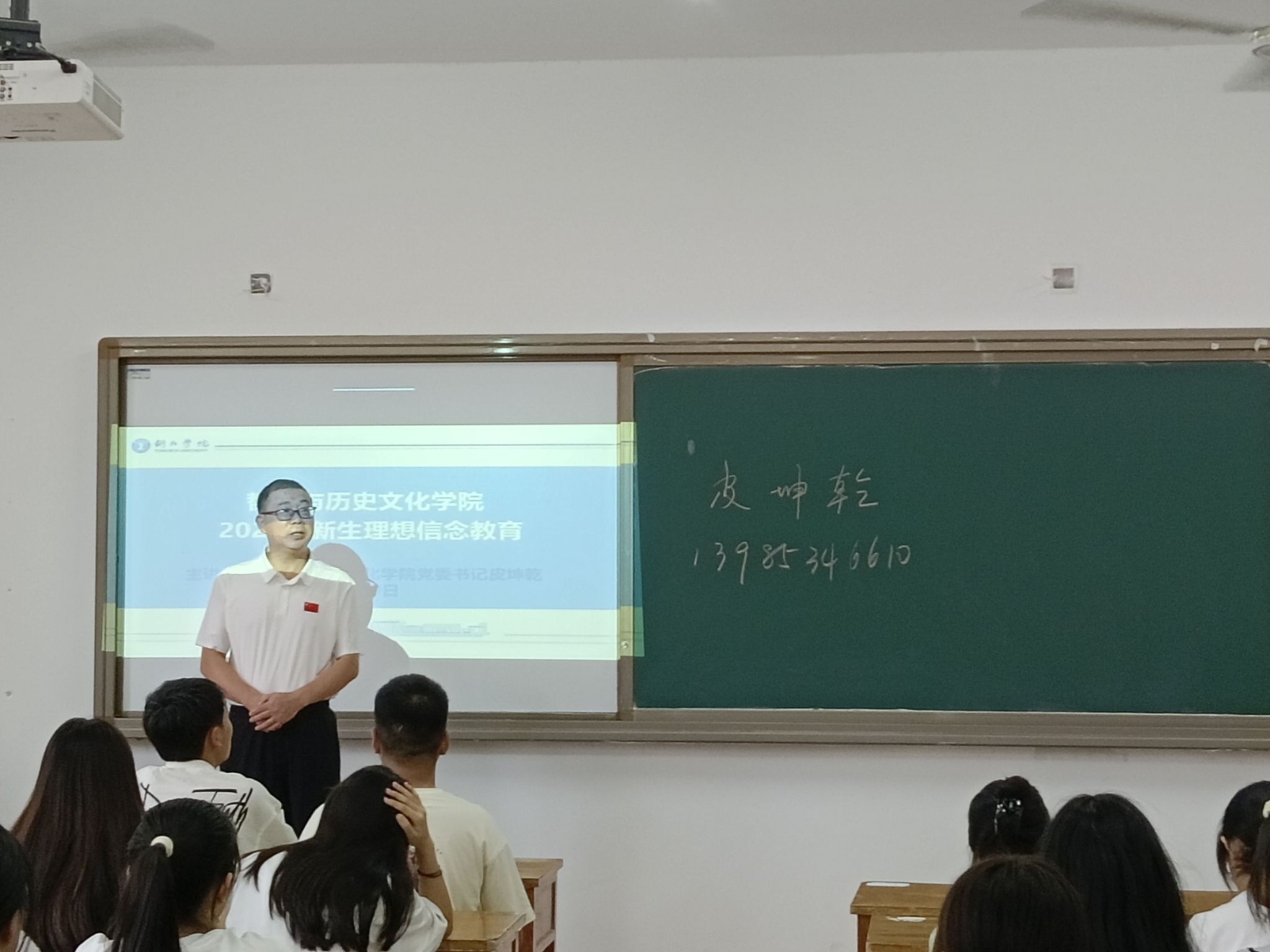 活动首先,皮坤乾教授祝贺同学们来到beat365中国唯一官网这个大家庭,为大家相逢哲学与历史文化学院感到高兴。皮教授随后为同学们讲解理想信念教育,他为同学们讲解了理想信念教育的五大基本内容:爱国主义教育、社会主义核心价值观教育、科学文化素质教育、人生意义教育、信仰教育,皮教授希望同学们志存高远,脚踏实地,坚定理想信念,遵纪守法,勤奋学习,不负父母和老师的期望。