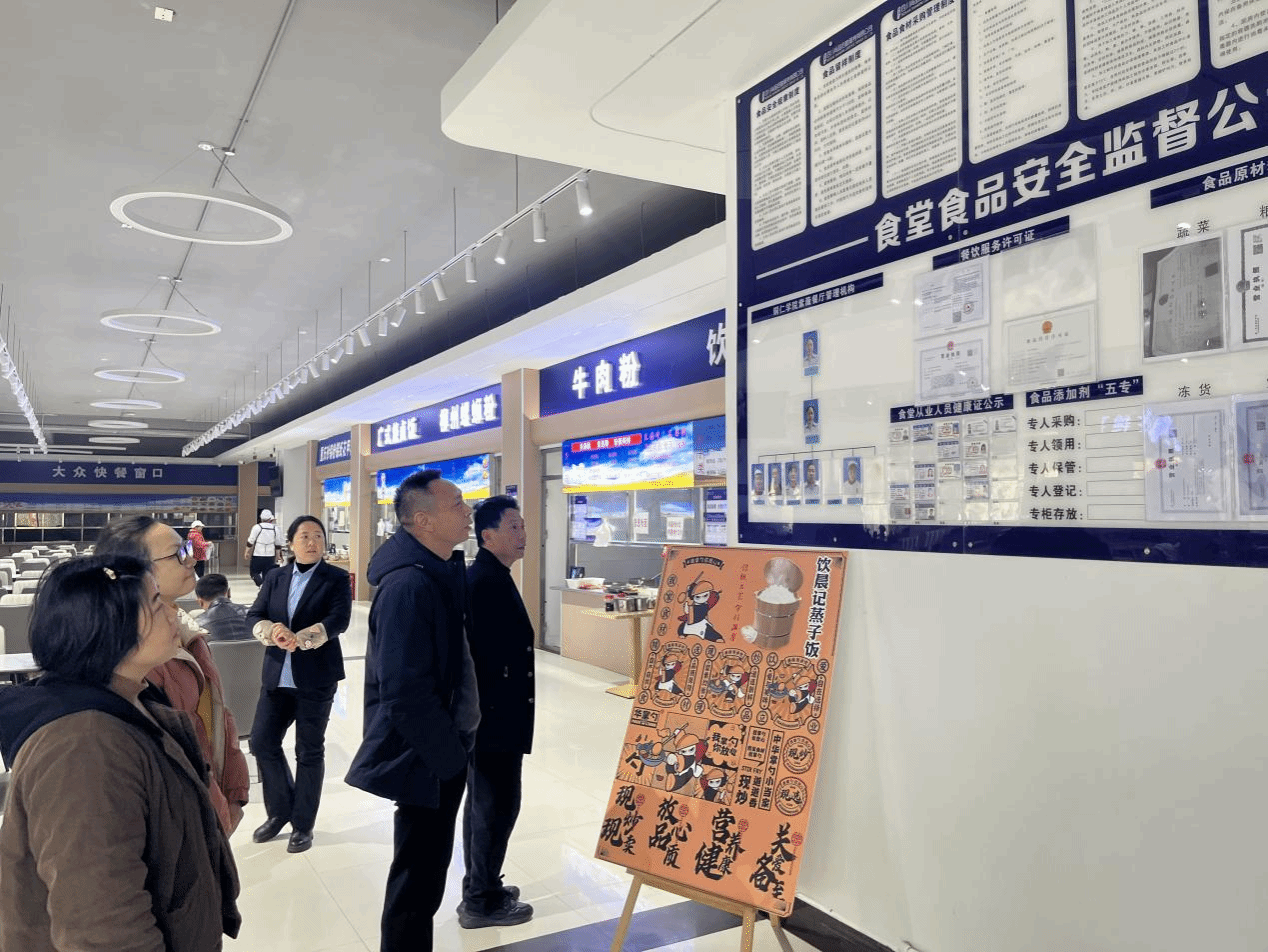 12月18日,铜仁市市场监管局副局长强自高等一行人到校督导beat365官网落实食品安全(A级主体)责任情况,我处副处长肖庭华及膳食科、食堂相关人员陪同检查。先后查看了食品安全管理责任人员公示栏,观看了明厨亮灶视频,仔细询问了从业人员健康管理情况,重点对食堂布局流程、食材进货台账、储存方式、索票索证、库存场所、加工间、售卖间、三防设施、留样等情况进行检查。
