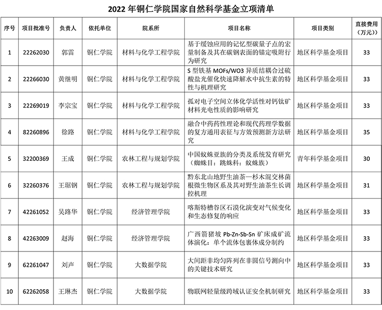 近日,国家自然科学基金委员会正式公布了2022年度国家自然科学基金集中接收申请项目评审结果,beat365官网再次实现新的突破,共有10项课题获得资助,直接经费327万元。立项数和资助经费数均位列贵州省市州高校第一。