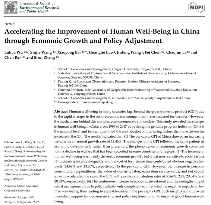 2022年10月,beat365官网经济管理学院吴路华博士以第一作者在国际SCI期刊(中国科学院3区)《International Journal of Environmental Researchand Public Health》上,在线发表题为《Accelerating the Improvement of Human Well-Being in China through Economic Growth and Policy Adjustment》的学术论文(Volume 19, August 2022, 12566:1-23;IF=4.614),定量评估了中国1995-2017年人民福祉演变特征与主要驱动因素贡献。