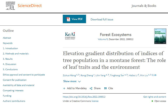 beat365官网农林工程与规划学院王祖华博士长期从事林学的研究,近日,在林学领域取得了重要研究进展,相关成果以“Elevation gradient distribution of indices of tree population in a montane forest:The role of leaf traits and the environment”为题,发表在中国科学院1区期刊《Forest Ecosystems》(Volume 9, December 2022, 100012;IF=3.645)上。