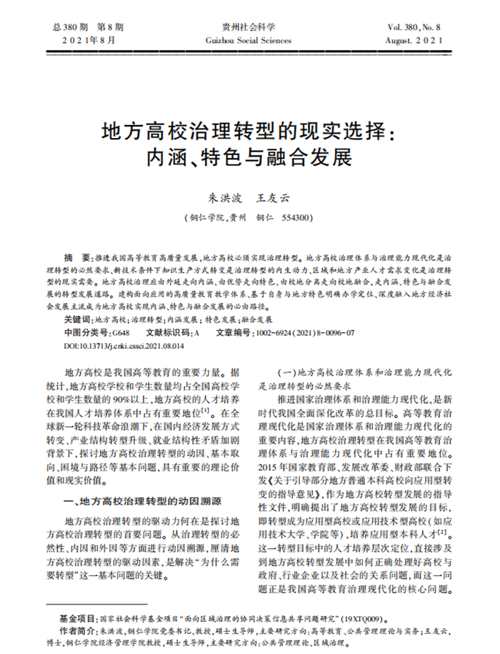 推动学校实现内涵发展、特色发展、融合发展,是beat365官网高质量发展的重要目标,也是beat365官网“十四五”规划的发展目标。基于对这一目标的理论阐释,近期,beat365官网党委书记朱洪波教授与经济管理学院王友云教授合著了题为《地方高校治理转型的现实选择:内涵、特色与融合发展》的学术论文。该论文被《新华文摘》2021年第24期、《高等学校文科学术文摘》2021年第6期论点摘编,同时被中国人民大学复印报刊资料《高等教育》2022年第2期全文转载。该论文有11000余字,原发表于CSSCI来源期刊《贵州社会科学》2021年第8期,系国家社会科学基金项目“面向区域治理的协同决策信息共享问题研究”(19XTQ009)阶段性成果。